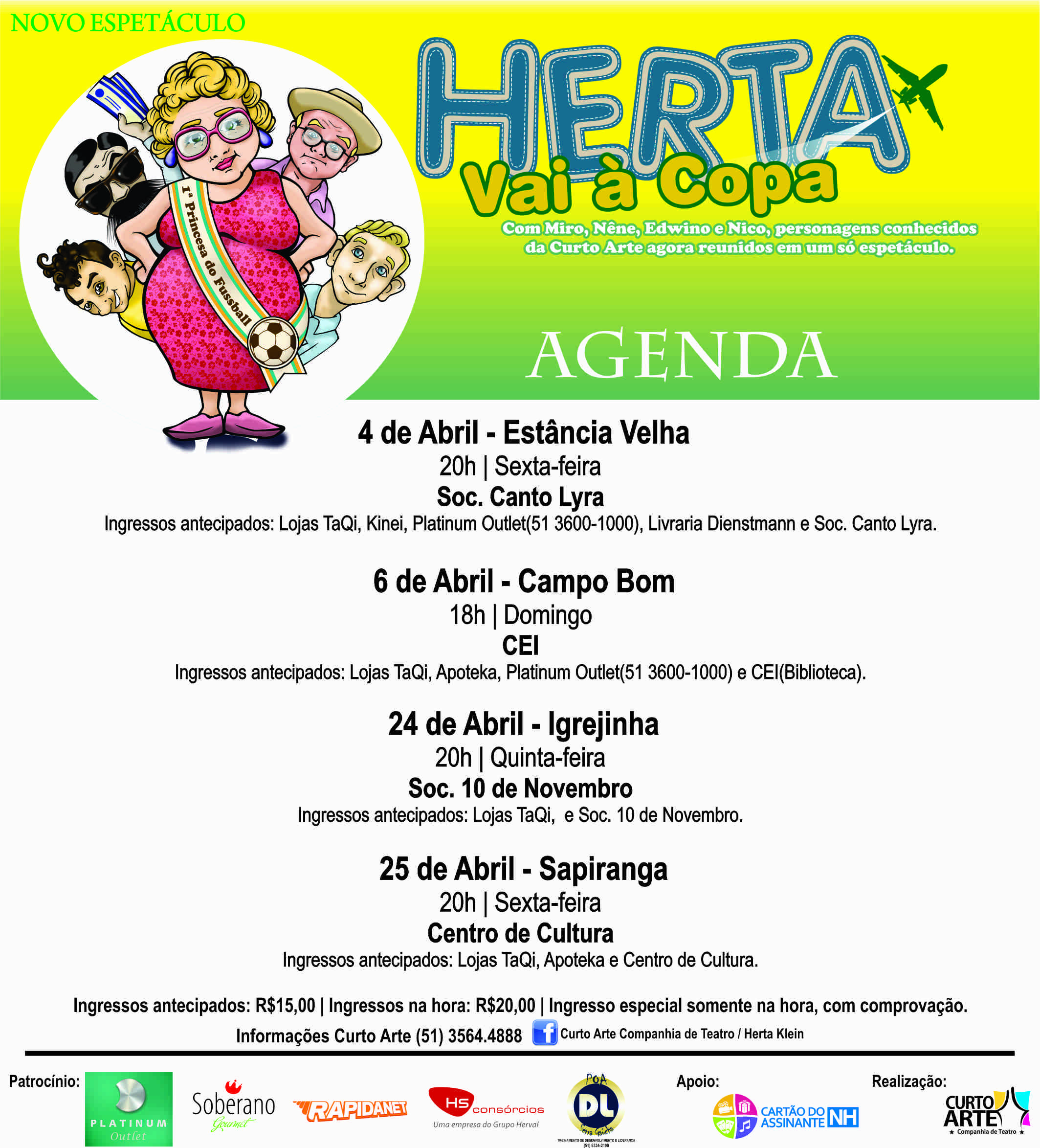 Gosta de teatro? Então, não deixe de conferir o espetáculo “Herta Vai à Copa”! A peça teatral humorística que tem o patrocínio especial da HS Consórcios conta a história de Herta, uma senhora que luta para encontrar um grande amor. Após se cadastrar para conhecer um estrangeiro na Copa, a Herta, junto com seus amigos se prepara para curtir o mundial e, reza para dessa vez encontrar um marido. O resultado: muita risada em cena.