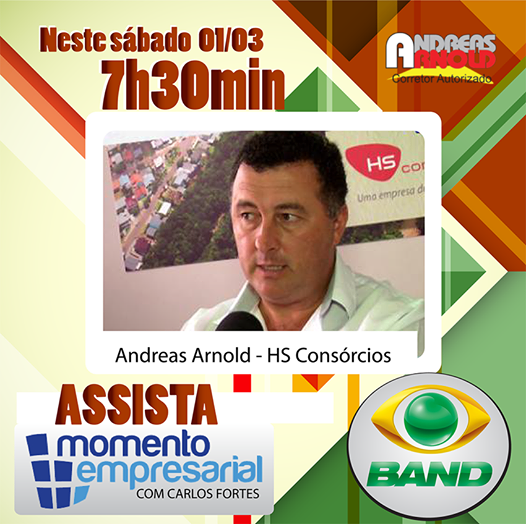 Neste sábado, o Programa Momento Empresarial receberá o Corretor Autorizado da HS Consórcios Andreas Arnold. Exibição na Band do Rio Grande do Sul. Programe-se: canal 10, às 7h30 deste sábado.